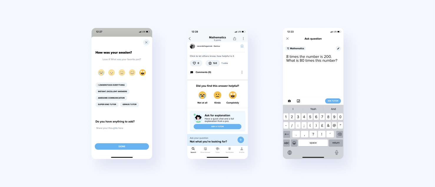 Aside from receiving help with their problem, the user is also given an opportunity to talk to the tutor via live chat and, for example, let them know if the answer was specific enough, or if it still needs some clarification, in order to reach full understanding. After the user disconnects, they are able to give feedback and rate the session with the tutor, and the tutors can do the same on their end.